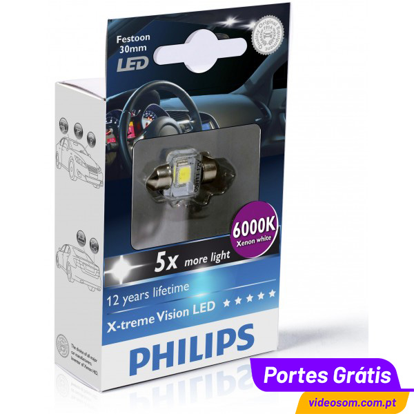 Os PHILIPS LED XTREME VISION constituem um artigo topo de gama da Philips. Proporcionam ao utilizador até 5 vezes mais luz do que a lâmpada convencional, baixo consumo e longevidade estimada de até 12 anos. A elevada duração é devida à elevada resistência ao choque e à tecnologia Philips que permite um melhor arrequecimento da lâmpada LED.  O modelo Philips LED tubular ( festoon ) Xtreme Vision é fabricado em vários tamanhos: 30mm , 38mm , 43mm , de modo a servir os diferentes tamanhos de lâmpadas tubulares.  Para cada tamanho existem várias opções: 4.000K ( branco quente ) e 6.000K ( branco frio).  Os Philips LED tubular ( festoon)  Xtreme Vision  são desenhados para uma utilização exclusiva no interior do veiculo, na iluminação de leitura,  cortesia, bagageira, guarda luvas, etc.