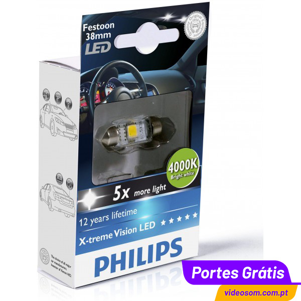 Os PHILIPS LED XTREME VISION constituem um artigo topo de gama da Philips. Proporcionam ao utilizador até 5 vezes mais luz do que a lâmpada convencional, baixo consumo e longevidade estimada de até 12 anos. A elevada duração é devida à elevada resistência ao choque e à tecnologia Philips que permite um melhor arrequecimento da lâmpada LED.  O modelo Philips LED tubular ( festoon ) Xtreme Vision é fabricado em vários tamanhos: 30mm , 38mm , 43mm , de modo a servir os diferentes tamanhos de lâmpadas tubulares.  Para cada tamanho existem várias opções: 4.000K ( branco quente ) e 6.000K ( branco frio).  Os Philips LED tubular ( festoon)  Xtreme Vision  são desenhados para uma utilização exclusiva no interior do veiculo, na iluminação de leitura,  cortesia, bagageira, guarda luvas, etc.