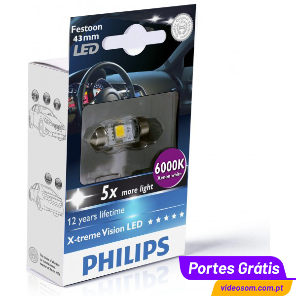 Os PHILIPS LED XTREME VISION constituem um artigo topo de gama da Philips. Proporcionam ao utilizador até 5 vezes mais luz do que a lâmpada convencional, baixo consumo e longevidade estimada de até 12 anos. A elevada duração é devida à elevada resistência ao choque e à tecnologia Philips que permite um melhor arrequecimento da lâmpada LED.  O modelo Philips LED tubular ( festoon ) Xtreme Vision é fabricado em vários tamanhos: 30mm , 38mm , 43mm , de modo a servir os diferentes tamanhos de lâmpadas tubulares.  Para cada tamanho existem várias opções: 4.000K ( branco quente ) e 6.000K ( branco frio).  Os Philips LED tubular ( festoon)  Xtreme Vision  são desenhados para uma utilização exclusiva no interior do veiculo, na iluminação de leitura,  cortesia, bagageira, guarda luvas, etc.